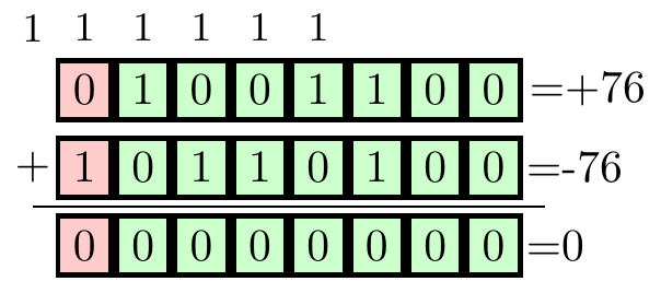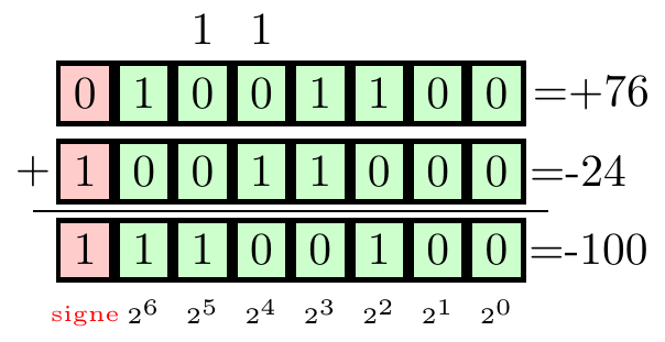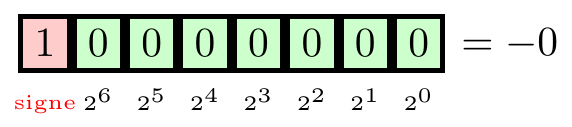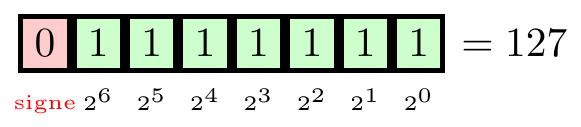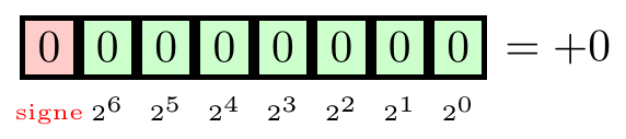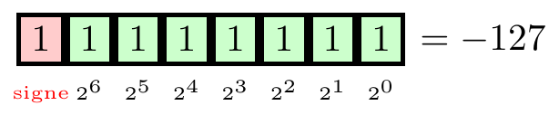 La représentation binaire signée sur \(n\) bits d’un entier est le train de bit où le premier bit de gauche représente le signe (positif si le bit est 0 et négatif si le bit est 1), et où les \(n-1\) bits restants représentent l’écriture de \(|x|\) en base 2.