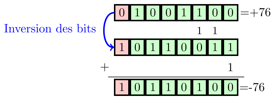 Les nombres négatifs sont obtenus en calculant l’opposé du nombre positif par deux opérations successives: