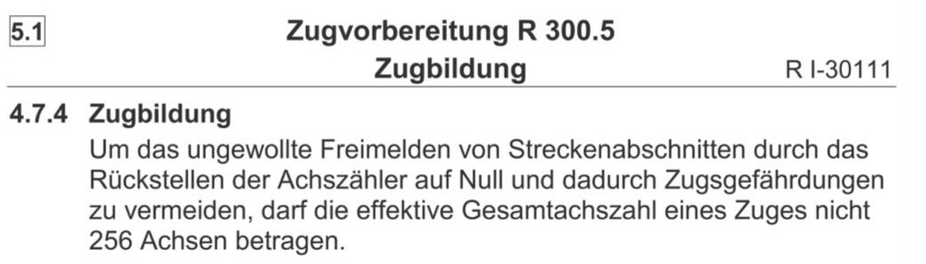 Le passage précédent se traduit par “Pour éviter de faussement signaler une section de rails comme étant vide, en remettant le compteur à zéro, le nombre total d’essieus d’un train ne doit pas être égal à 256”.